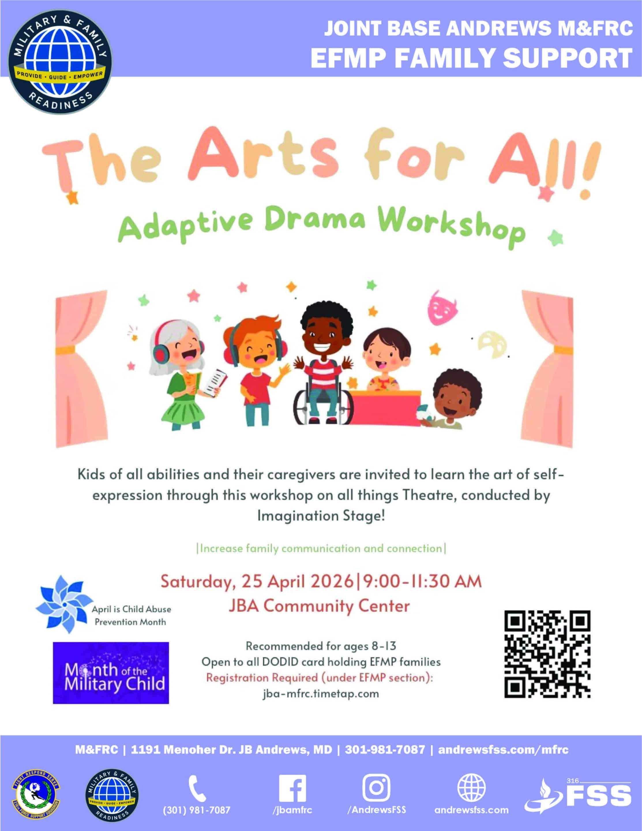 Join the Joint Base Andrews M&FRC EFMP Family Support for "The Arts for All! Adaptive Drama Workshop"! 🎠 Enjoy a free creative drama workshop for those enrolled in EFMP, along with their immediate family members! Experience a sampling of all things theatre—including body, movement, expression, and engagement. Kids of all abilities and their caregivers […]